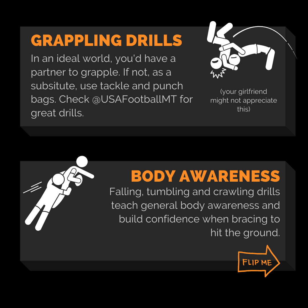 1. Grappling Drills: In an ideal world, you’d have a partner to grapple. If not, as a subsitute, use tackle and punch bags. Follow @USAFootball MT for great grappling drill advice. Here’s a few simple drills you can do too: